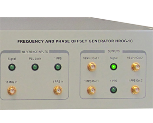 The HROG-10 is a high-resolution phase and frequency offset generator. The phase and frequency of the output signals are adjustable with respect to a 10 MHz user supplied reference. The output phase resolution of the generator is 2π/232 radians or an output time step resolution of 0.2 fs. The output frequency resolution is 5 x 10-19. Both phase and frequency steps are phase continuous. The instrument provides two sine-wave outputs and two pulse outputs. The sine-wave outputs are buffered to provide greater than 80 dB of port-to-port and reverse isolation. The outputs are at a level of +13 dBm. The pulse outputs are derived from the sine-wave outputs by dividing by a factor of 10.0E6. The pulse outputs can be synchronized to an external reference pulse to within 100 ns. All instrument functions are displayed and controlled via the front panel LCD display and keypad. Remote control of the instrument is possible through RS-232 communications.